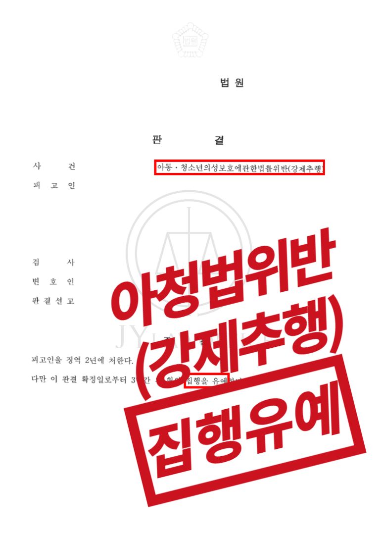 본 사건의 의뢰인은 미성년자인 피해자의 신체를 만져 '아동ㆍ청소년의성보호에관한법률위반(강제추행)'혐의를 받게 되었습니다. 이에 의뢰인은, 사건에 대한 법리적인 자문을 얻기 위해 본 JY법률사무소로 사건을 의뢰해 주셨습니다.