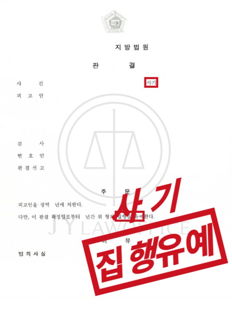 변호인의 조력으로 의뢰인은 '사기'혐의에 대해 집행유예의 판결을 받고 무사히 사건을 종결시킬 수 있었습니다.
