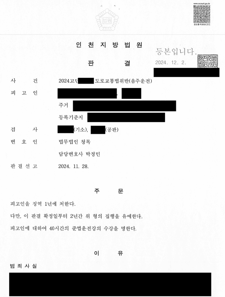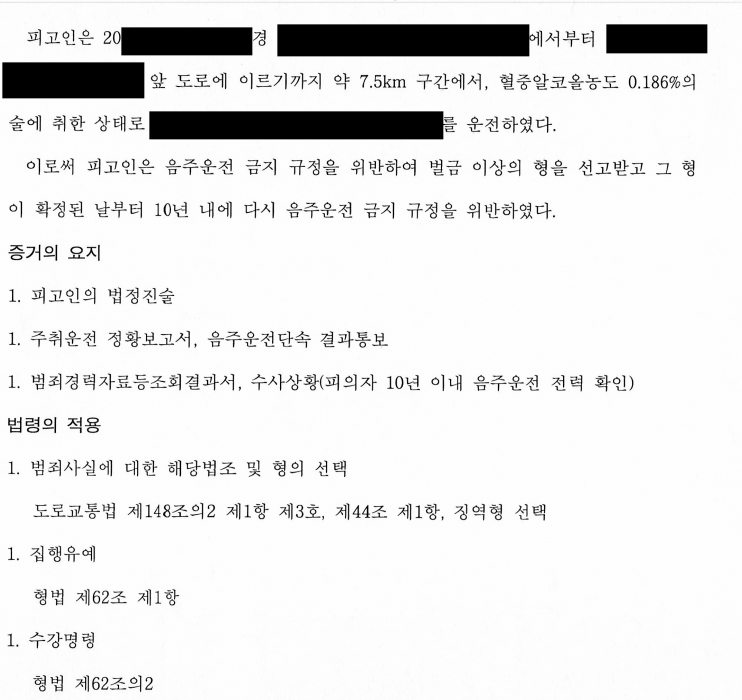 이하에서는 음주운전 5회차에 혈중알코올농도 0.186%로 적발되어 실형 위험이 매우 높은 상황에서, 집행유예를 선고받은 의뢰인의 사례를 소개해 드리고자 합니다.