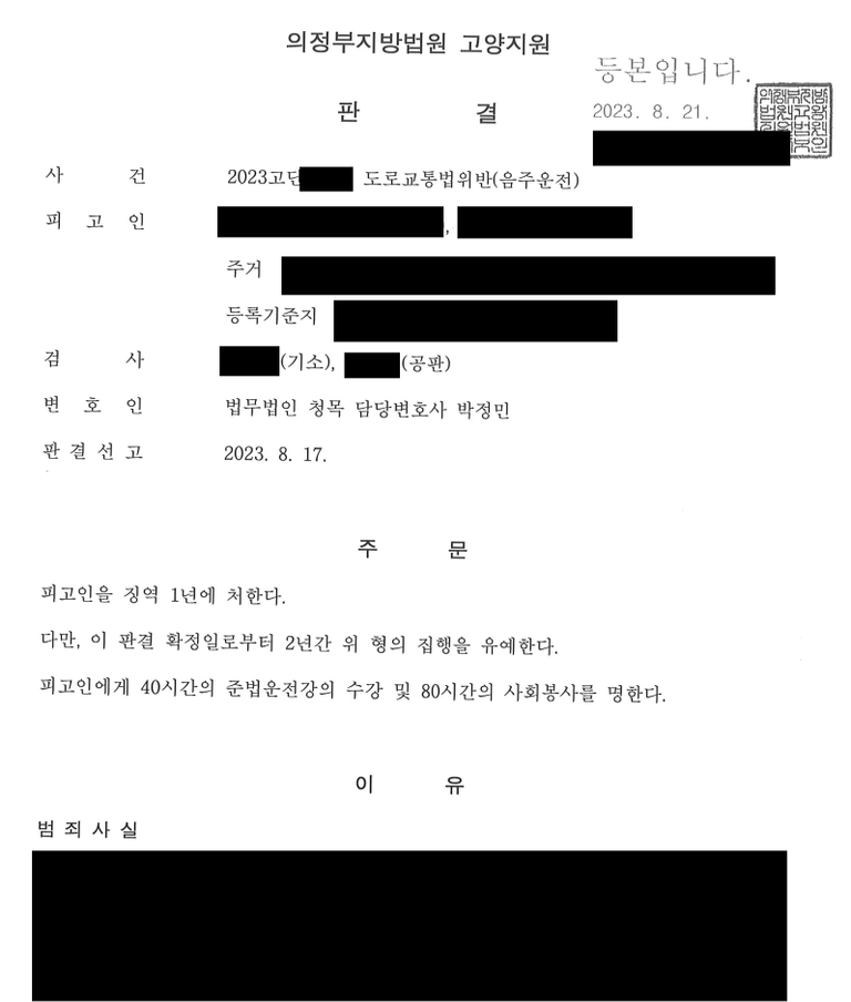그 결과 의뢰인은 실형을 면하여 집행유예의 선고를 받는 최선의 결과를 받아낼 수 있게 되었습니다.