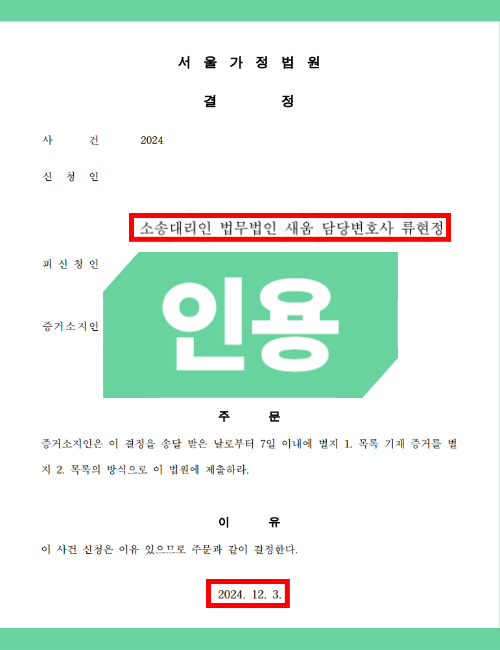 법무법인 새움에서는 11월 22일에 증거보전신청을 진행했고, 배우자와 상간자가 호텔에서 나온 장면을 목격한 날짜와 시간대에 대한 증거보전결정을 12월 3일에 받을 수 있었습니다. 신속하게 신청 및 결정을 받은 경과 무사히 증거를 확보하여 유리하게 사용할 수 있게 되었습니다.