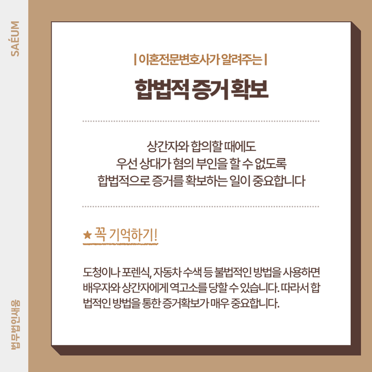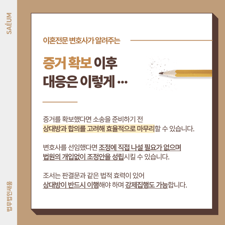 증거가 명확하게 없을 때 상대방이 자신이 저지른 외도를 인정하지 않을 가능성이 높습니다. 따라서 합의하거나 조정을 하고자 할 때도 우선은 상대방이 혐의를 부인할 수 없도록 증거를 확보하는 것이 중요합니다. 만일 증거 없이 상대방을 추궁하는 경우 이후 상대방이 증거를 인멸하는 등의 문제가 생겨날 수 있기에 반드시 모든 대응을 하기에 앞서 증거부터 확보해야 합니다.