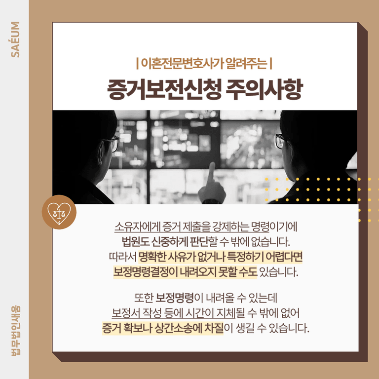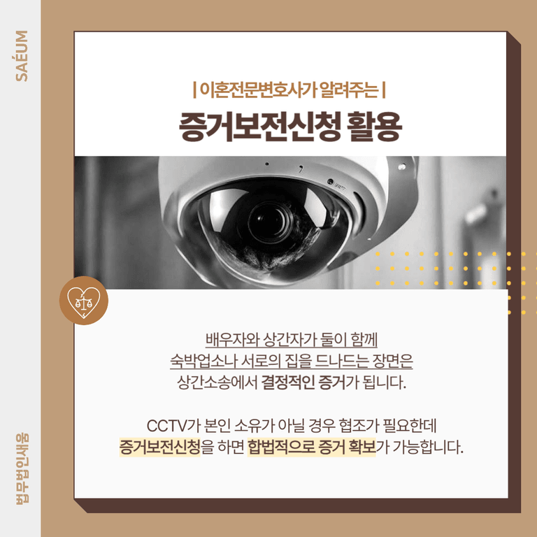의뢰인 A씨는 배우자의 외도를 알게 된 후 이혼 및 위자료 소송 청구를 위한 증거확보를 위해 법무법인 새움을 찾아오셨습니다. A씨는 배우자와 상간자가 호텔에서 함께 나오는 모습을 목격한 바가 있었는데요. 예상치 못한 상황에 그 당시 바로 증거를 확보하지 못한 상황이었습니다. 이후 소송을 제기하기 위해서 증거물을 확보해야 했기 때문에 증거보전신청이 필요했습니다. CCTV의 기록은 30일이며 이후에는 삭제가 될 가능성이 높기에 가능한 한 빠르게 결정을 받아 필요한 증거를 확보할 수 있게끔 도움을 드리기 위해 노력했습니다.