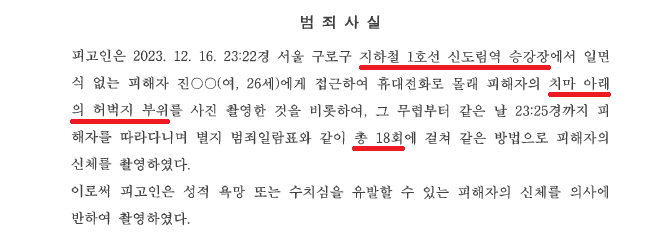 A씨는 2023. 12. 16. 23:22경 퇴근하고 귀가하는 길 지하철 승강장에서 여성 B씨를 발견하고 너무나도 마음에 들어 계속 쫓아다니며 총 18회에 걸쳐 B씨의 치마 속 등 신체를 몰래 촬영하였습니다.