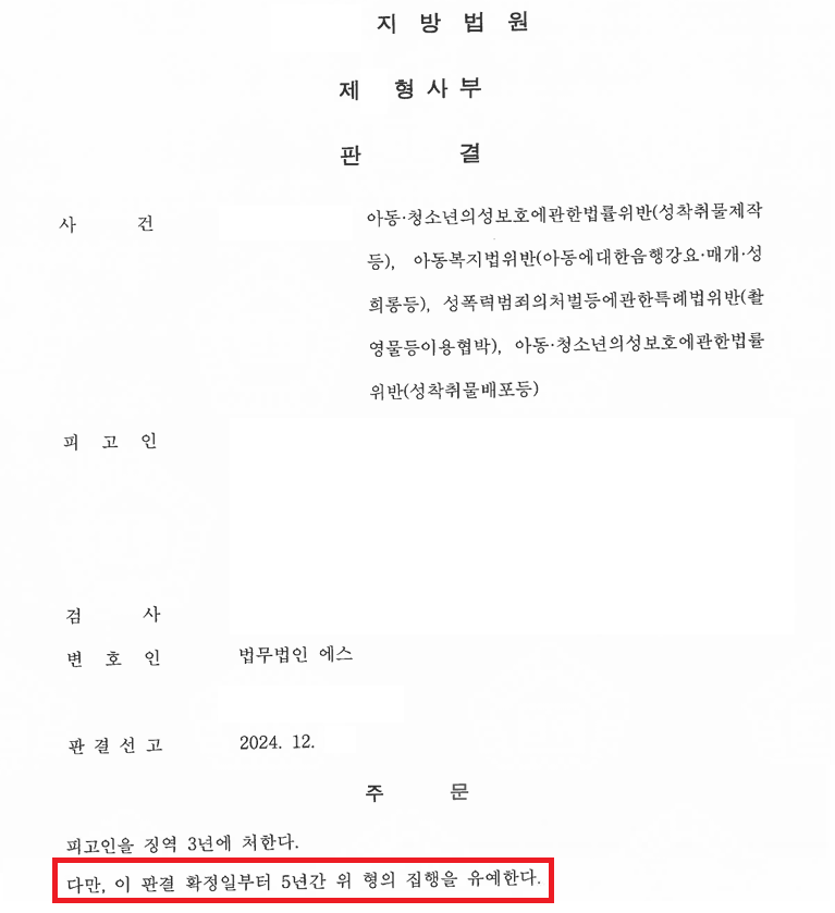 5. A씨는 아동청소년성착취물제작등 사건에서 저희의 조력을 받음으로써 공판 단계에서 집행유예를 선고받고 가족의 품으로 돌아갈 수 있었습니다.