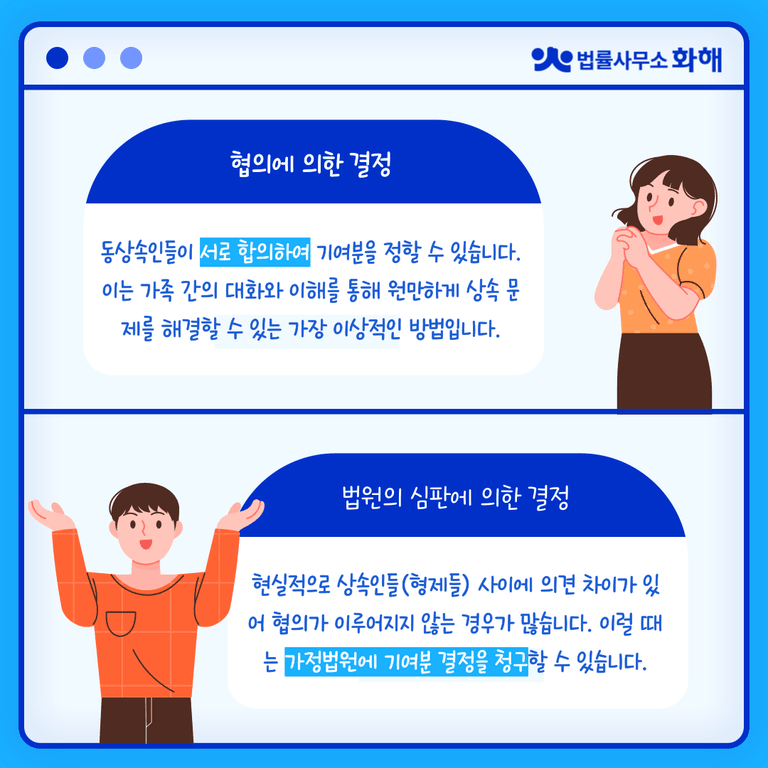 하지만 현실적으로 상속인들(형제들) 사이에 의견 차이가 있어 협의가 이루어지지 않는 경우가 많습니다. 이럴 때는 저희 화해처럼 가사법 전문 변호사들의 법률 조력을 받아 기여분 결정을 청구할 수 있습니다.