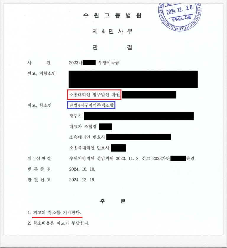 그러나 이와 같은 법원의 판결에도 피고 탄벌4지구지역주택조합 측은 패소를 인정하지 못하고, 항소하였습니다.