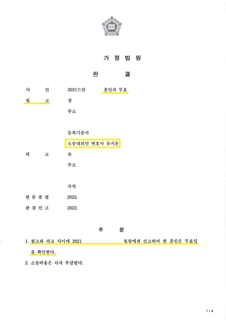 혼인무효가 인정되기는 사실상 어렵기 때문에 대다수의 경우 혼인무효가 아닌 이혼으로 정리하고 있습니다. 하지만 의뢰인은 이혼이 아닌 혼인무효 판결을 받기를 간절히 희망하였고, 결국 혼인무효 판결을 받아 전부 승소한 사안입니다.
