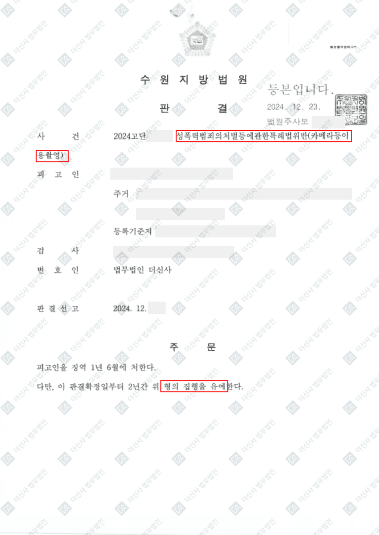 촬영 횟수가 매우 많은 사안이었기에 빠르게 특정 가능한 피해자와의 합의를 시도하였고, 사전 시뮬레이션 과정을 통해 조사 시 진술에도 철저히 준비를 하였습니다. 특정이 어려운 피해자를 제외한 나머지 인원과 빠르게 합의에 성공하였으며 결국 의뢰인은 실형이 아닌, 집행유예라는 성공적인 결과를 얻을 수 있었습니다.
