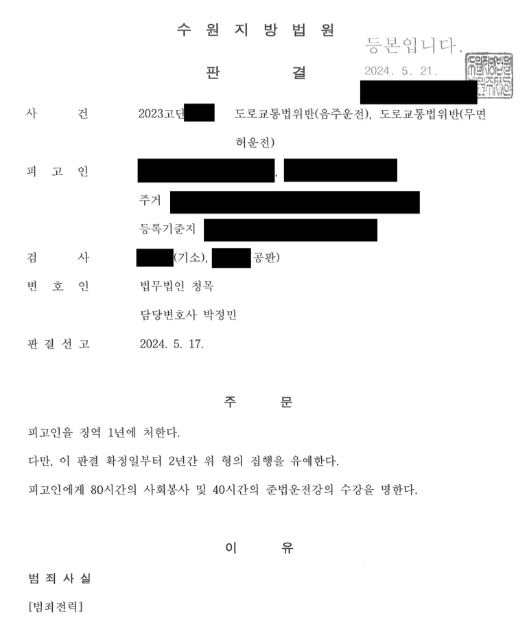 이하에서는 음주운전 4회차인 데에다, 3진 이후 결격기간 중에 운전하여 무면허운전까지 결합된 상태에서 적발되어 실형 위험이 매우 높은 상황에서, 집행유예를 선고받은 의뢰인의 사례를 소개해 드리고자 합니다.