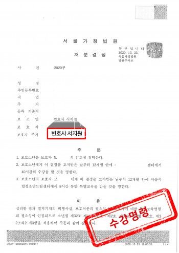 재판부는 서지원 변호사의 주장에 따라, A에게 가정 위탁 처분(1호)과 수강 명령 처분(2호)을 내리기로 결정하였습니다.