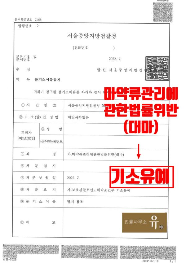 서울중앙지방검찰청은 법률사무소 유(唯)의 마약전문변호사가 작성한 변호인의견서 내용을 대폭 수용하여 의뢰인의 범죄사실을 인정하면서도 스스로의 잘못을 인정하고 반성하고 있는 점, 수사에 협조적이었던 점, 재범의 가능성이 없다는 점은 물론 적극적인 치료의지 등을 이유로 ‘보호관찰소선도위탁조건부 기소유예’ 처분을 하였습니다.