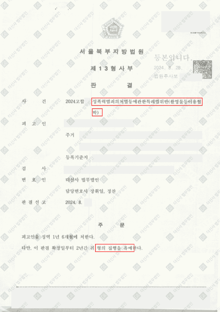 촬영물등이용협박, 특히 그 대상이 미성년자인 경우 실형의 가능성은 매우 높습니다. 벌금형이 없는만큼 집행유예가 아니라면 무조건 징역형을 살아야했기에 이번 사안에서는 더욱 집행유예가 필요했고 더신사만의 성범죄 전문 솔루션을 통해 성공적인 결과를 얻을 수 있었습니다. 언제든 비슷한 상황에 놓여있다면 상담예약주세요.