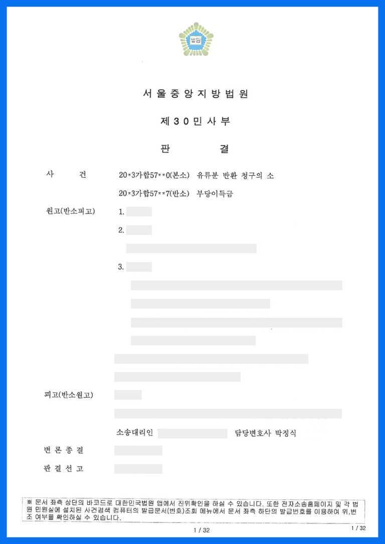 다. 법원은 원고들의 피고에 대한 유류분 반환청구 본소와 피고의 원고들에 대한 부당이득반환청구 반소를 모두 인용하면서 양 당사자 간의 채권액중 대등한 범위 내의 금액은 상계로 소멸하였고 원고 1의 피고에 대한 반환채무가 남았다고 하면서 원고 1에게 피고에 대한 반환의무를 이행하라는 판결을 선고하였습니다.