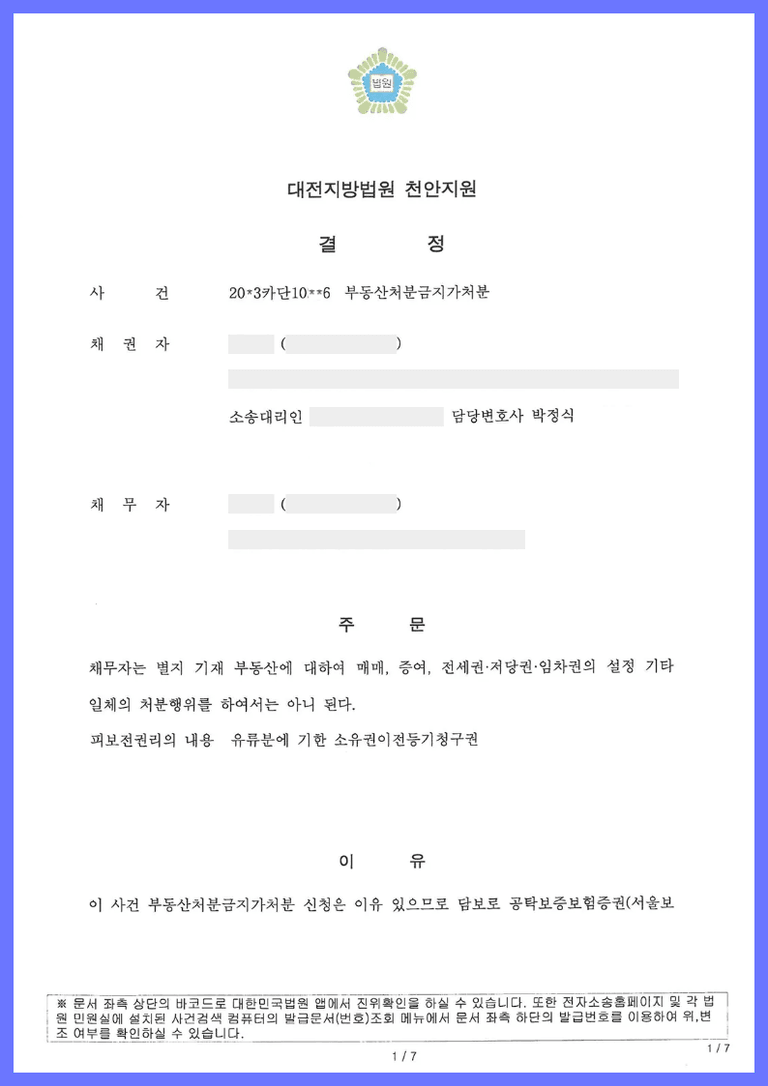② 채무자가 증여받은 부동산의 경우 최근 개발 붐으로 인하여 거래가 매우 활발한 부동산으로 시급하게 부동산처분금지가처분을 해둘 필요성을 인정하여 처분금지가처분 결정을 내렸습니다.