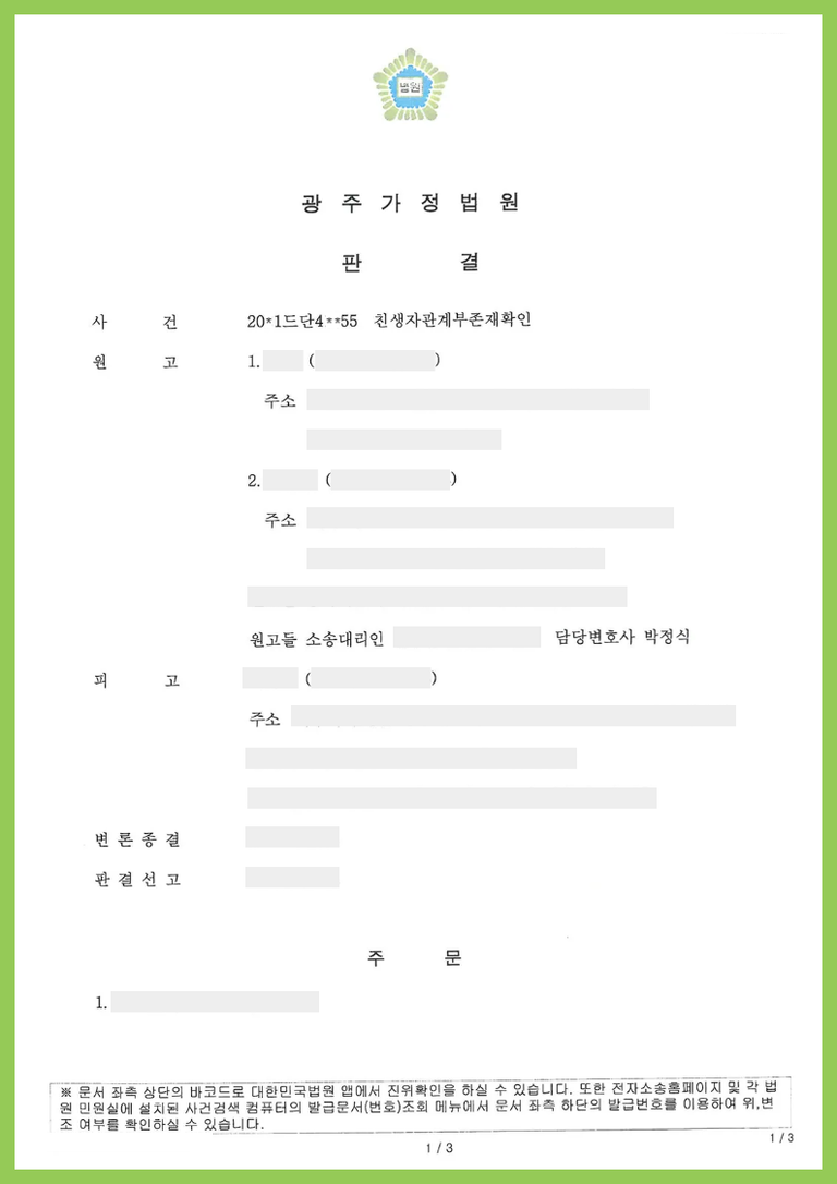 원고는 배우자와의 사이에서 자녀 1명을 나아 양육하였는데, 최근 배우자가 사망하여 배우자의 재산을 상속하려다가 보니 배우자의 제적등본에 배우자의 자녀로 등재되어 있는 자가 있어, 상속처리를 하지 못하고 있는 상황이 되었습니다.