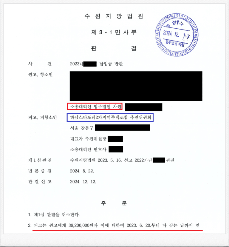 그러나, 가입 후 피고 하남스타포레2차지역주택조합 추진위원회 측의 사업이 계획대로 진행되지 않았고, 이에 의뢰인은 정식 민사소송을 통하여 기 납입한 금원의 반환을 원하셨으나 1심에서는 원하시는 결과를 얻지 못하여 제게 항소심을 의뢰하셨습니다.