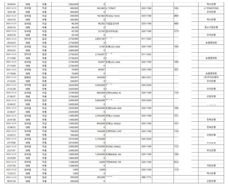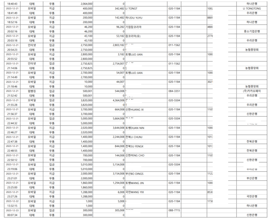 시간을 보시면 몇초, 몇분 단위로 계속해서 돈이 입금되고 있으며, 외국인 명의 계좌로 또 다시 출금이 이루어졌습니다. 이렇게 본인도 모르는 사이, 수백 수천 수억의 출입금 내역이 광범위하게 남아있는 있었기에 의뢰인의 상황은 절대적으로 불리했습니다.