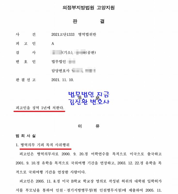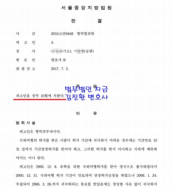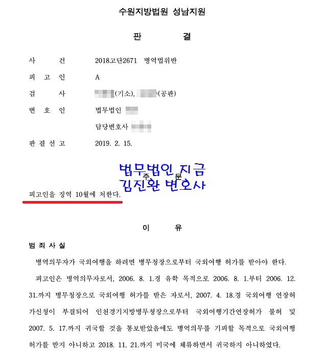 이때에는 병역의무 면탈을 위해 국외로 도주하였고 결과적으로도 병역의무를 회피하였기 때문에 실형이 선고되는데 징역 10개월이 선고되는 경우가 많습니다.