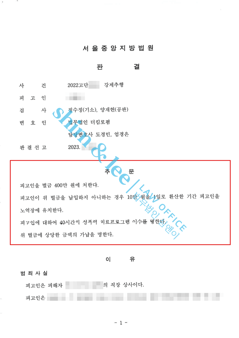3. 1심 재판부는 ①껴안은 행위에 대하여는 CCTV증거가 있기 때문에 강제추행 혐의를 인정, 유죄로 판단하였습니다. 그러나 ②옷 안으로 손을 집어 넣어 가슴을 만지고 입을 맞춘 행위에 대해서는 증거가 부족하기 때문에 이 부분은 무죄로 판단한다며, 일부 혐의를 인정하고 벌금 400만 원을 선고하였습니다.