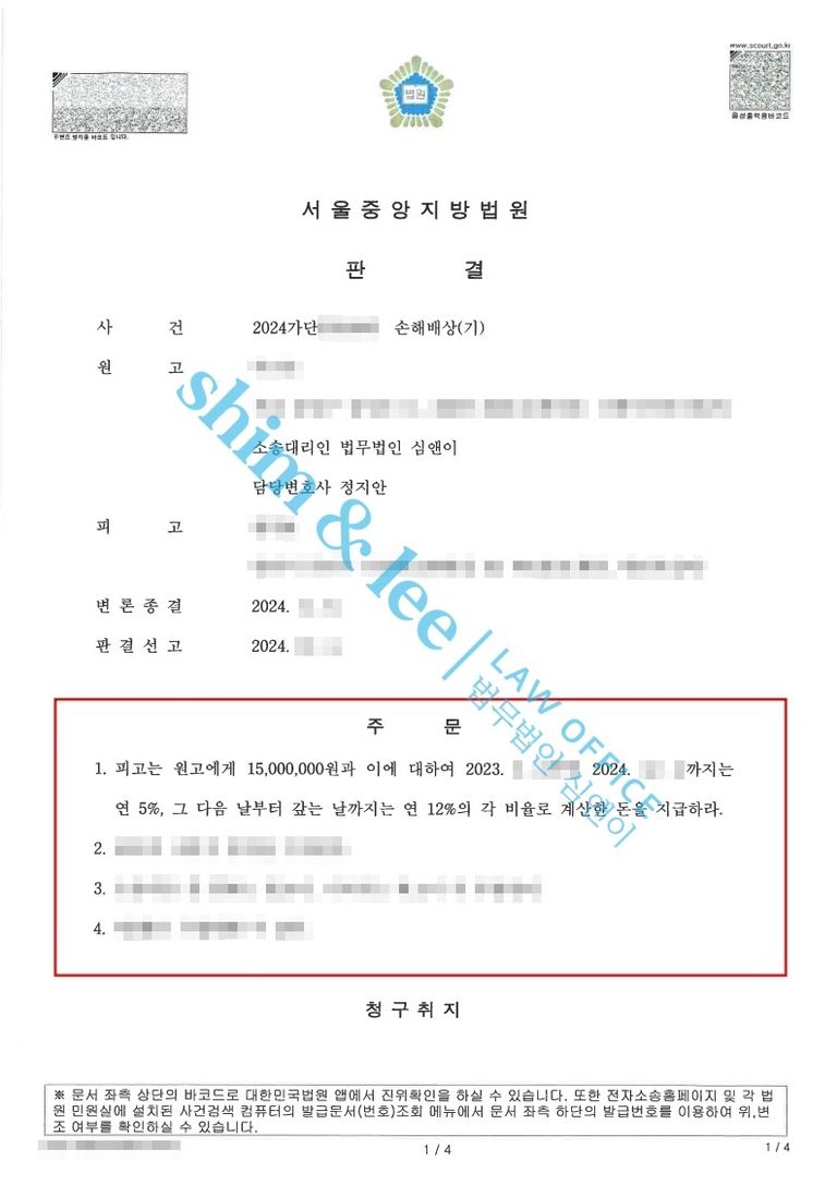 - 담당 변호사님은 즉시 가해자에게 연락하여 소송 비용 계산서와 법인 계좌를 전달하며 기한에 맞춰 위자료를 지급하길 통보하였습니다. 이에 이의 없으며 곧바로 판결금을 지급하겠다는 가해자의 의사까지 확인하여 추후 복잡한 문제가 생기지 않도록 끝까지 사건에 대해 조력을 하였습니다.