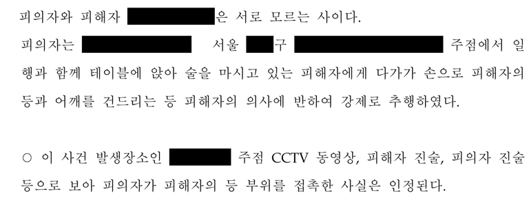 의뢰인은 2024.경 주점에 방문하였다가 술에 취하였고, 이러한 와중에 의뢰인은 피해자 여성의 어깨, 등을 건드려 일행과 시비가 붙었습니다. 이로 인해 112신고가 되었고, 의뢰인은 강제추행죄로 처벌 받을 위기에 처해 변호사의 조력을 구했습니다.