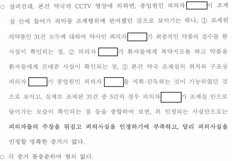 이에 사건 당일(신고 시점) 위 약국은 조제 약사가 부득이하게 오전 출근을 하지 못하면서, 국장(약사)이 카운터와 조제실을 오가면서 종업원의 조제 행위를 지휘 감독 하였는데, 신고인은 단순히 종업원이 조제실에서 '어떠한 행위'(조제실은 밖에서 볼 수 있는 구조가 아니었습니다)를 한다는 이유로 의뢰인들을 신고하기에 이르고 말았습니다.