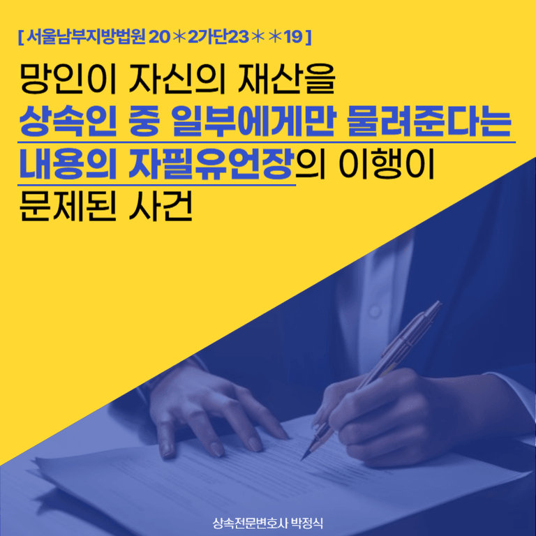망인이 사망한 후, 원고들은 망인의 자필유언에 의한 유증에 기하여 피고를 상대로 유증 내지 사인증여 이행을 구하는 이 사건 소를 제기하였습니다.