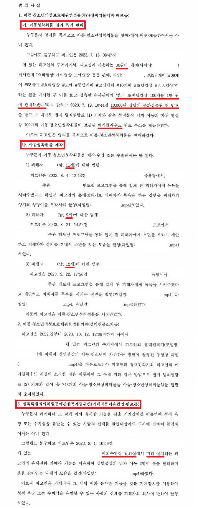 A씨는 2022.경부터 2023. 10. 12.경까지 총 743개의 성착취물을 소지하면서, 2023. 7. 19.경 10:44경 트위터에 성착취물을 판매한다는 광고를 게시하며 성착취물 100개를 10,000원에 판매하고, 2023. 8. 1. 10:59경 야외수영장 탈의실에 휴대폰을 설치하여 몰래 촬영하고, 2023. 8. 4.경부터 2023. 9. 22.경까지 B군(11세), C군(9세), D군(12세)의 성기를 촬영한 혐의로 구속되어 재판을 받게 되었습니다.