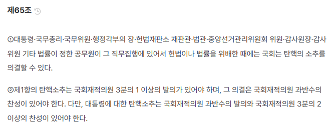 국무총리 탄핵소추는 어떻게 될까요? 헌법 65조 1항에 있습니다. 국회 재적의원 1/3 이상 발의+ 재적의원 과반수 찬성이면 됩니다. 대통령을 제외한 국무총리, 국무위원 (장관) 등등도 마찬가지입니다. 헌법에는 대통령만 특별한 가중 요건을 두고 있습니다. 나머지는 모두 똑같습니다.