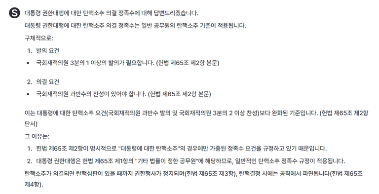 하지만 권한대행은 선출된 권력이 아닙니다. 때문에 헌법재판소도 민주적 정당성 있는 국회의 행위를, 민주적 정당성 없는 권한대행을 위해서 보호, 제약할 이유가 없습니다. 헌법재판관 스스로도 선출된 권력이 아닙니다. 때문에 국회의 행위를 사법으로 재단하기 위해서는 또다른 선출된 권력을 보호할 필요가 있을 때만 가능한데, 지금은 그런 상황은 아니라는 생각입니다. 물론 이건 제 개인적인 의견입니다. 명시적인 규정이 없을 때 헌법의 취지를 봐야하는데, 헌법 및 민주적 정당성 관점에서 권한대행의 탄핵을 대통령 수준까지 어렵게 하는 것은 말이 안 되기 때문입니다.