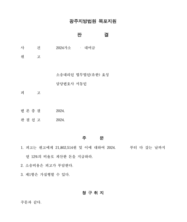 저는 즉각 대여금청구소송을 제기하여 대화내용 등으로 대여사실을 주장 입증하였고 법원은 원고 승소 판결을 선고하여 의뢰인은 이를 변제받았습니다.