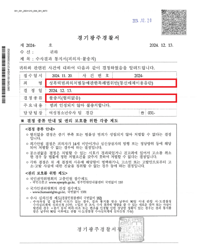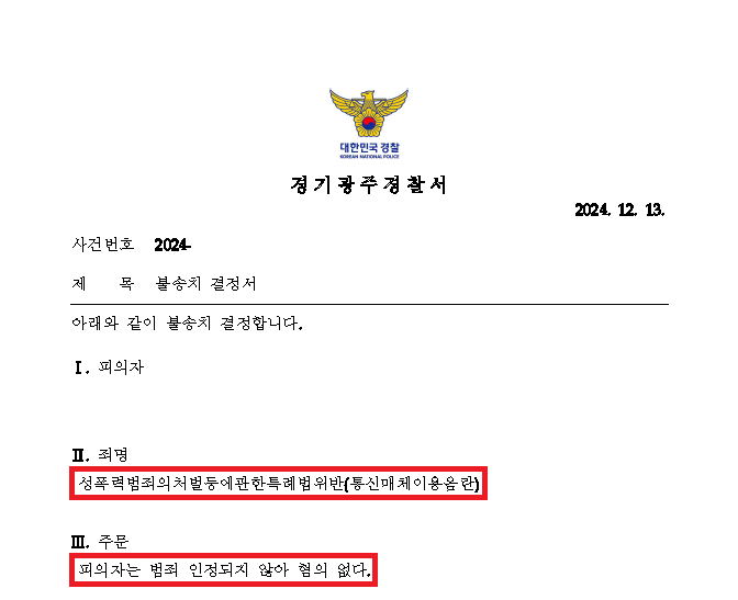 이러한 저의 조력을 바탕으로 A씨는 '불송치(혐의없음)' 결정을 받음으로써 억울하게 성범죄자가 될 위기에서 벗어날 수 있었습니다.