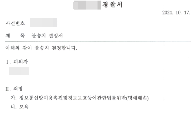 저희가 위와 같이 사건의 배경을 명확하게 전달하며, 명예훼손에 관한 법원의 입장을 철저하게 분석하고 치밀하게 법리적 주장을 개진한 결과, 경찰에서는 의뢰인분의 명예훼손죄, 모욕죄에 대하여 전부 불송치 무혐의 처분을 결정했습니다!