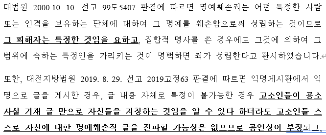 저희는 위와 같이 명예훼손의 요건 중 하나인 ‘특정성’에 관한 법리를 설시한 대법원 판례와 하급심 판례를 인용하여 ‘글 내용의 당사자는 게시글의 내용을 보고 자신을 지칭하는 것임을 알 수 있다고 하더라도, 당사자 스스로 자신에 대한 명예훼손적 글을 전파할 가능성은 없으므로 공연성이 부정되어 그것만으로는 명예훼손이 성립하지 않는다’는 법원의 입장을 정리하였습니다.