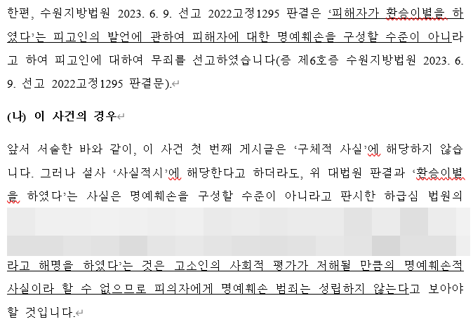 저희는 이 사건과 유사하게 전남자친구가 환승이별을 하였다는 내용의 게시글을 SNS나 블로그 등에 게시한 사안에 대하여 무죄를 선고한 하급심 법원의 다수 판결례를 최대한 동원하여, 이 사건에서도 마찬가지로 혐의가 인정될 수 없다는 점을 재차 강조하였습니다.