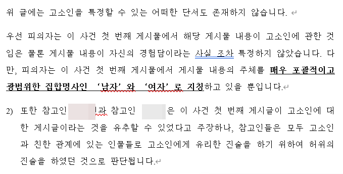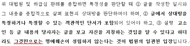 앞에서 말씀드렸듯, 이 사건은 상대방이 ‘의뢰인 분이 작성한 게시글 내용의 특정성이 인정된다’는 취지의 제3자의 사실확인서를 다수 제출한 사건으로, ‘특정성’을 부인하기 위하여는 ‘특정성’ 관련 대법원의 법률적 판단 기준을 명확히 하고, 제출된 사실확인서의 신빙성을 다툴 필요가 있었습니다.