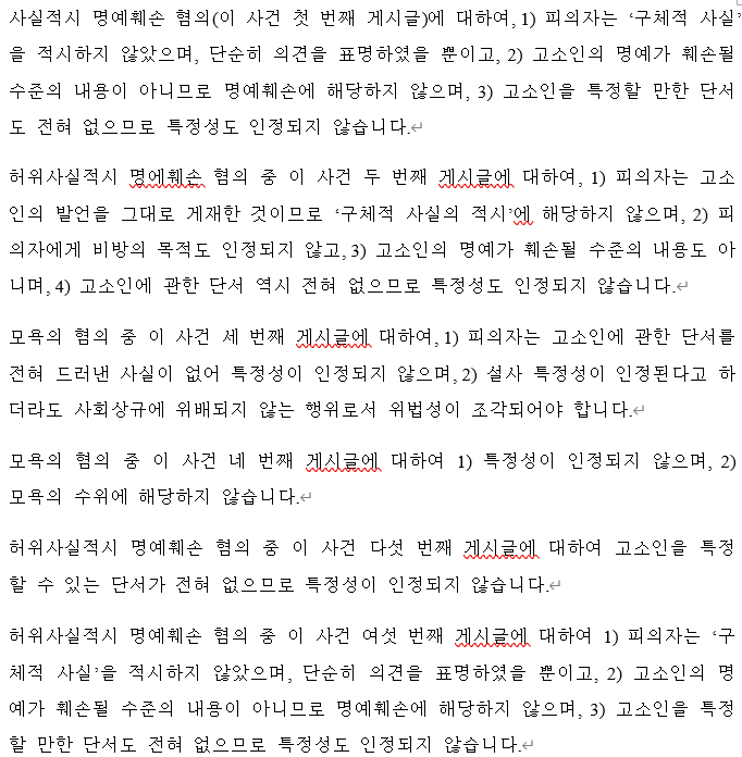 이 사건의 경우, 위와 같이 ‘특정성이 인정되지 않는다’는 주장만으로 명예훼손죄, 모욕죄가 성립할 수 없다는 점은 충분히 받아들여졌을 것입니다. 그럼에도 불구하고 저희는 혹시 모를 결과를 방지하기 위하여 설령 ‘특정성’이 인정된다고 하더라도 의뢰인 분이 작성한 게시글의 내용은 단순히 ‘의견 표명’에 해당하므로 범죄가 성립될 수 없다는 점에 대한 법적인 주장을 보강하였습니다.