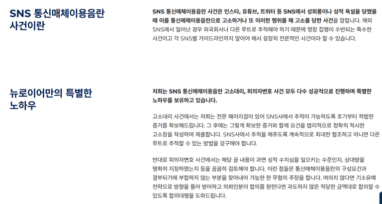 저희 뉴로이어는 사이버범죄를 특화로 하는 로펌으로 악플 고소, 인스타 통매음 고소 등 저희가 많이 수행해온 몇 개 사건을 핵심 사건으로 지정해 관련 피해를 입은 의뢰인분들을 전문적으로 도와드리고 있습니다.