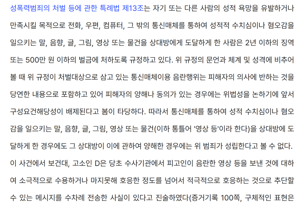 예를 들어 성적인 이야기를 먼저 유도한 경우, 성희롱 발언에 대해서 오히려 아무렇지 않게 받아준 정황, 바로 증거 캡처하고 합의금 요구하는 경우 등 소위 헌터로 의심되거나 암묵적 동의가 인정되는 경우에는 통매음 처벌이 어려울 수 있습니다.