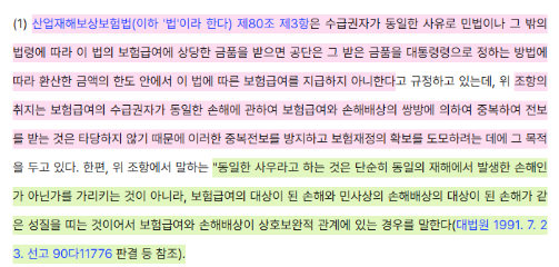 산재보험급여와 손해배상이 동일한 사유일 때 중복전보가 금지됩니다. 그렇다면 어디까지나 동일한 사유인지 문제됩니다. 판례에 의하면, 단순히 동일한 재해가 아니라, 손해가 같은 성질인지를 기준으로 판시합니다. 아래와 같습니다.