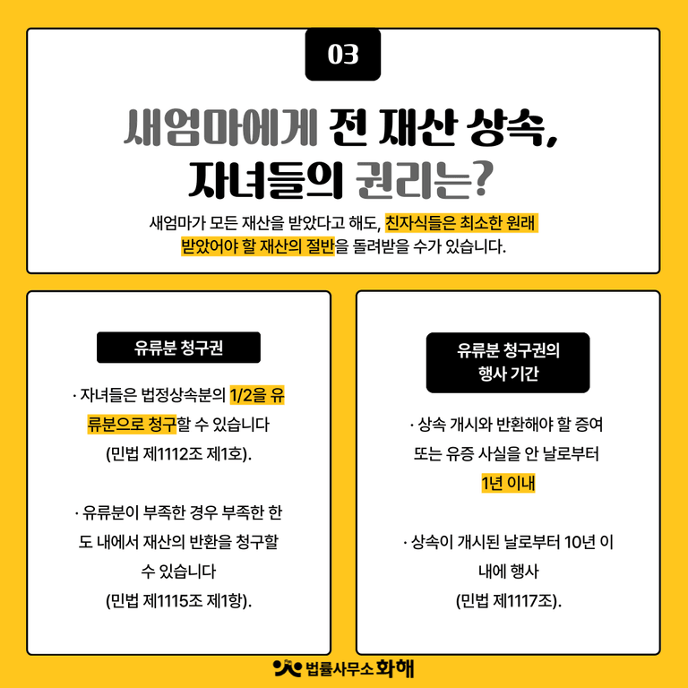 · 자녀들은 법정상속분의 1/2을 유류분으로 청구할 수 있습니다(민법 제1112조 제1호).