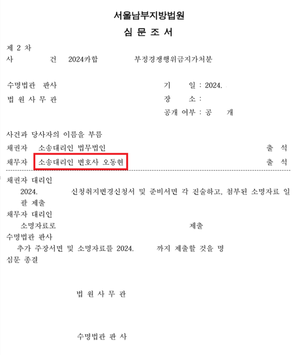 첫 번째 심문기일에서 재판부는 저희 측의 주장을 살펴보신 후 생각에 잠기시더니 상대방(채권자) 측 대리인(변호사)에게 이대로 가면 신청이 기각될 수밖에 없다는(=진다는) 듯한 의사를 표시하였습니다. 다른 채무자가 깨갱하고 불리한 조건으로 합의를 한 상황에서, 의기양양한 자세로 재판에 나왔던 상대방(채권자) 측은 몹시 당황한 눈치였습니다. 잠시의 시간이 흐른 후, 상대방은 재판부에게 주장을 변경하여서 가처분 신청을 이어가겠다고 하였고, 재판부는 기일을 속행하였습니다.