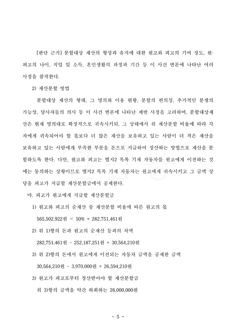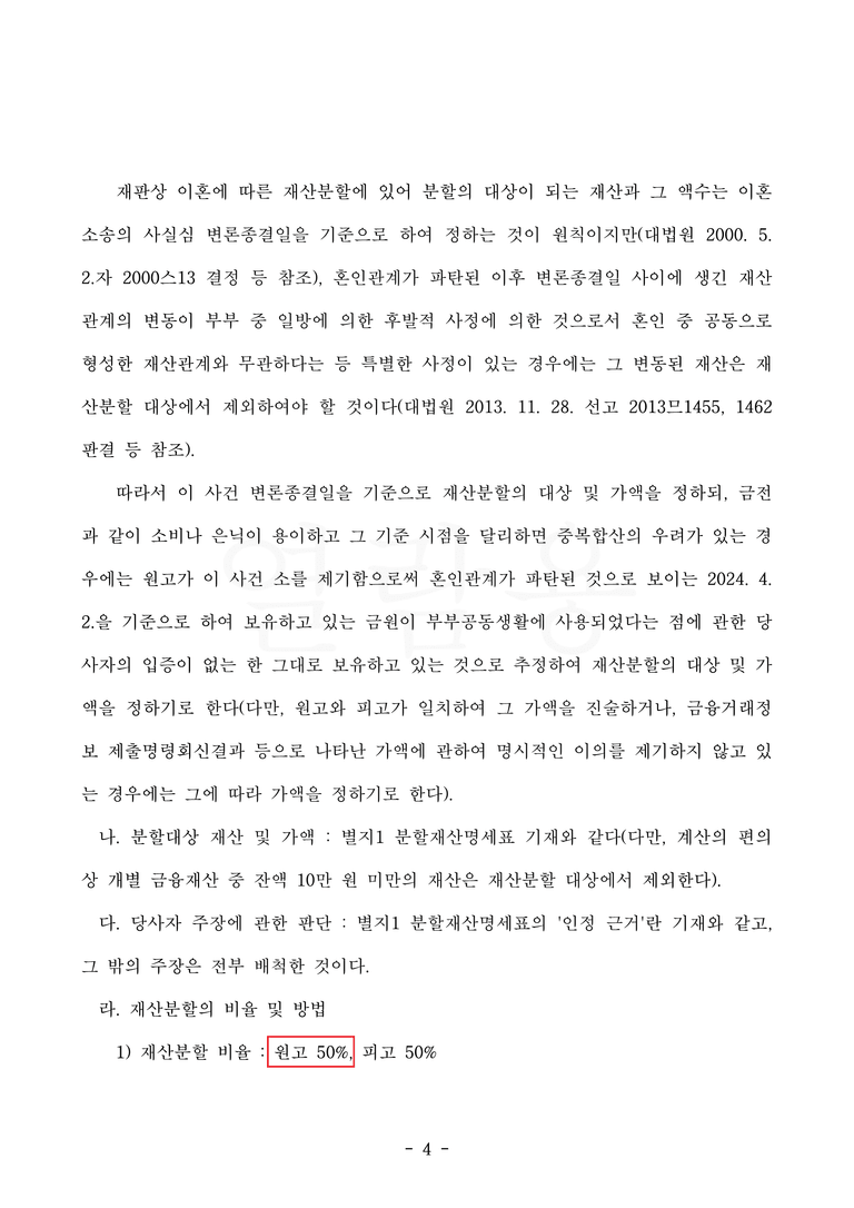 남편 측은 소송에서 저의 의뢰인이 가정주부였고, 생활비를 많이 사용했기 때문에 저의 의뢰인의 기여도가 30%에 불과하다고 주장했습니다. 저는 의뢰인이 가사와 육아를 전담해 왔고, 이를 통해 남편이 아무 걱정 없이 일할 수 있었다는 점, 의뢰인이 지출한 생활비는 거의 모두 양육에 관련된 것이고, 의뢰인 자신을 위해 사용한 것은 거의 없다는 점, 결혼기간이 20년 가까이 된다는 점 등을 피력하며 남편 측의 주장은 아무런 이유가 없고, 의뢰인의 기여도가 50%로 정해져야 한다고 법원을 설득했습니다.