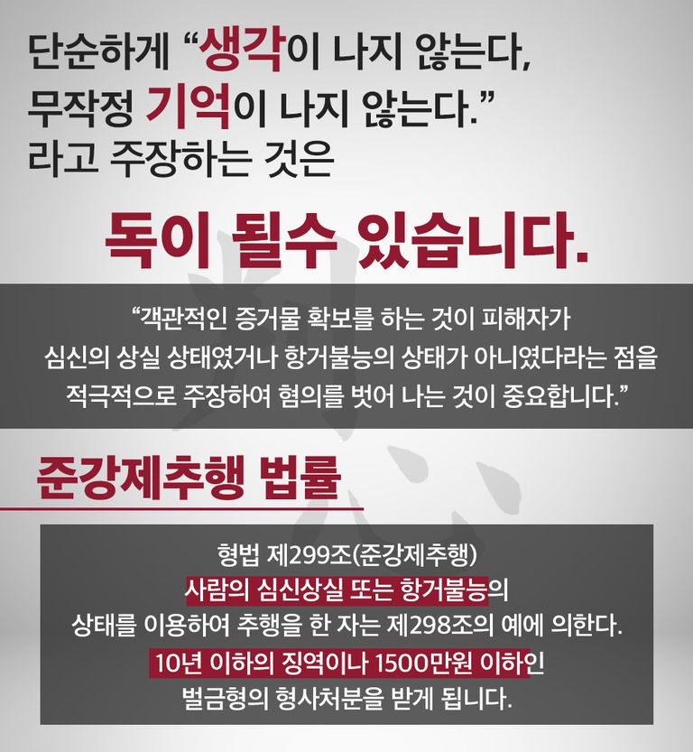반면 상대가 심신상실이나 항거불능의 상태가 아니었다는 점이 인정된다면 무혐의를 주장할 수 있는 만큼
