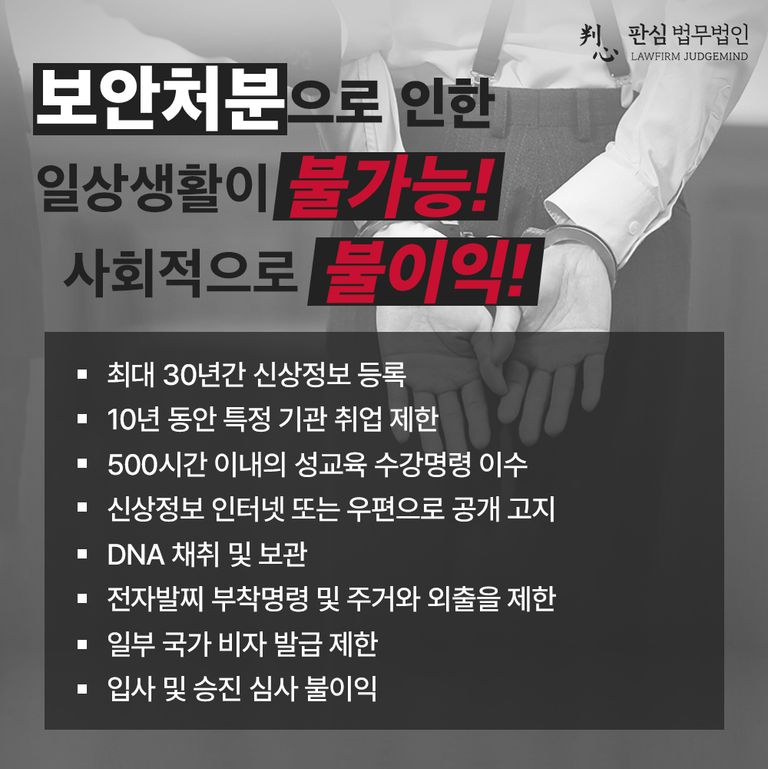 성범죄 보안처분은 성범죄자라는 신상정보가 공개 또는 등록되고, 전자발찌 착용을 명령받을 수 있고 일부 기관에 대한 취업 제한 명령 및 일부 국가 비자 발급 제한 등 제안한 조치가 내려질 수 있습니다.
