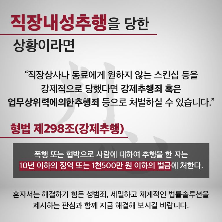 파악해야 하겠습니다. 직장상사나 동료에게 원하지 않는 스킨십 등을 강제적으로 당했다면