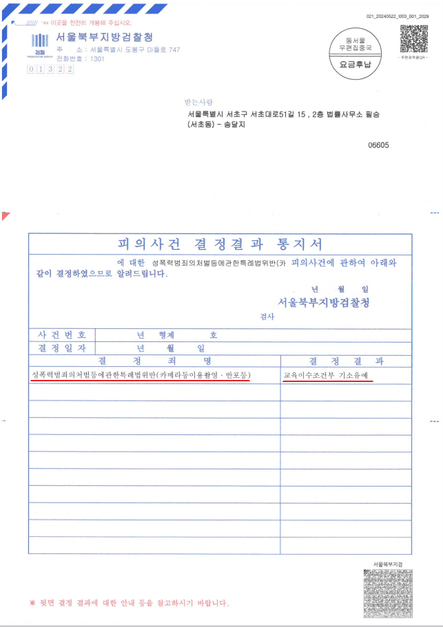 그러나 안내해드린 양형자료들과 선처를 호소하는 변호인의견서 및 경찰 조사 동행, 합의 진행을 통해 서울북부지방검찰청은 의뢰인님에게 "기소유예처분"을 내렸습니다. 이로 인해 의뢰인님께서는 전과 기록이 남지도 않고, 신상정보 공개, 고지, 등록 대상도 되지 않았습니다.