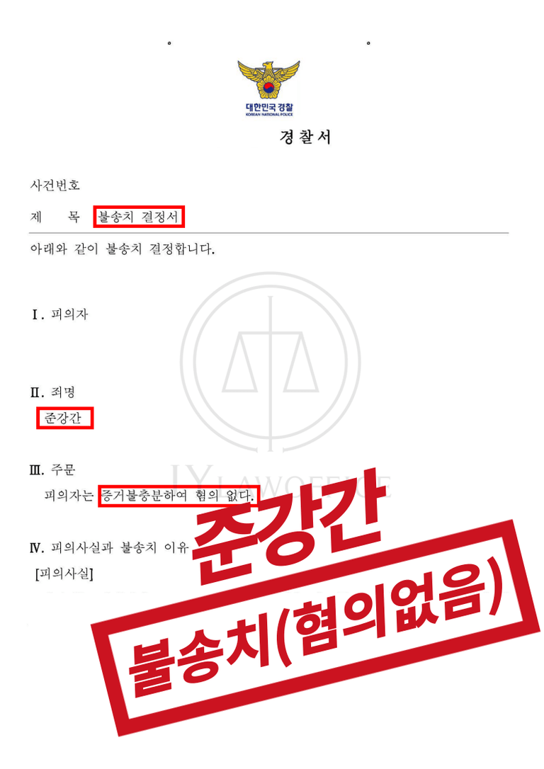 이와 같은 변호인의 조력에 따라, 의뢰인은 준강간 혐의에 대하여 '불송치(혐의없음)' 처분을 받고 사건을 무사히 종결시킬 수 있었습니다.