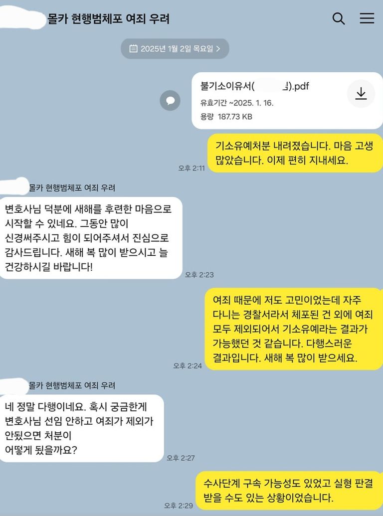 제가 디지털성범죄 분야에서 많은 무혐의, 무죄를 받고 있는 것은 많은 사람이 알고 있을 것입니다. 무혐의, 무죄만이 아니라 이례적인 비율로 기소유예, 선고유예를 받고 있는 이유는 수사 단계에서 압수수색영장 범죄사실만으로, 체포 사유된 범죄사실만으로 수사 대상을 한정하는 방향으로 진행하고 있기 때문인 것 같습니다. 제가 변호하는 의뢰인들 대다수는 여죄까지 수사가 확대되지 않고 마무리하고 있으며 이는 제가 변호했고 변호사고 있는 많은 의뢰인들이 증인일 것입니다. 이 사안에서도 현행범 체포된 해당 사안만 수사 대상으로 한정하여 해당 피해자 한 명과 합의 후 기소유예라는 결과를 얻을 수 있었습니다. 특히 카메라등이용촬영죄, 몰카 등 촬영과 관련된 범죄, 아동청소년성착취물, 불법촬영물 관련 디지털성범죄에 있어서는 우려하는 여죄가 있는 것이 거의 대부분이라 제 변호의 최우선 순위 역시 여죄로 수사가 확대되는 것을 막는 것입니다.